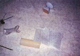 1994.11.24 성체 강림과 함께 성모님께서 메시지를 주셨는데 메시지를 쓰고 있을 때 마귀가 나타나서 꽃병과 촛대를 집어던지고 책상도 집어던져 머리를 다치게 하면서 공격한 모습(이때 메시지를 쓰고 있던 편지지가 물에 다 젖었다.)