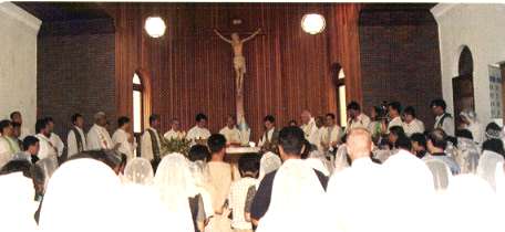1997.6.30 국내외 30여명의 신부님들이 12주년 특별 미사를 집전하시고 계신다(A). 성체를 모신 후 메시지를 받고 있는 율리아 자매(B).