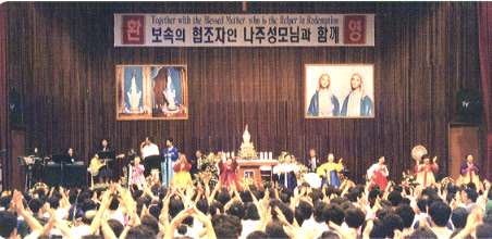 "수많은 자녀들이 내 아들 예수를 다시 십자가에 못박고 있지만 너희는 나의 눈물과 피눈물을 기념하기 위하여 세계 각처에서 나의 초대에 '아멘'으로 응답하여 모여와 주었으니 너희 모두를 나의 성심안에 안아주어 새롭게 양육하여 너희를 기르겠다."