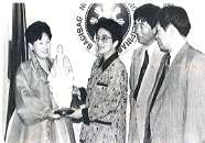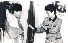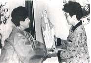 1992.5.25 필리핀 대통령 코라손 아키노 여사의 초청을 받아 대통령궁을 방문하여 함께 기도하며 성모님상을 전달하고 계시는 율리아 자매님.(이때 대통령궁에서 나주 성모님 메시지 전달도 있었다.)